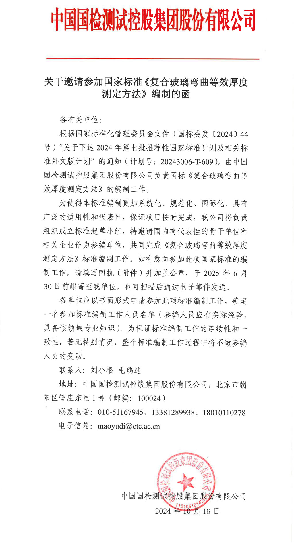 關(guān)于邀請參加國家標準《復(fù)合玻璃彎曲等效厚度測定方法》編制的函 |