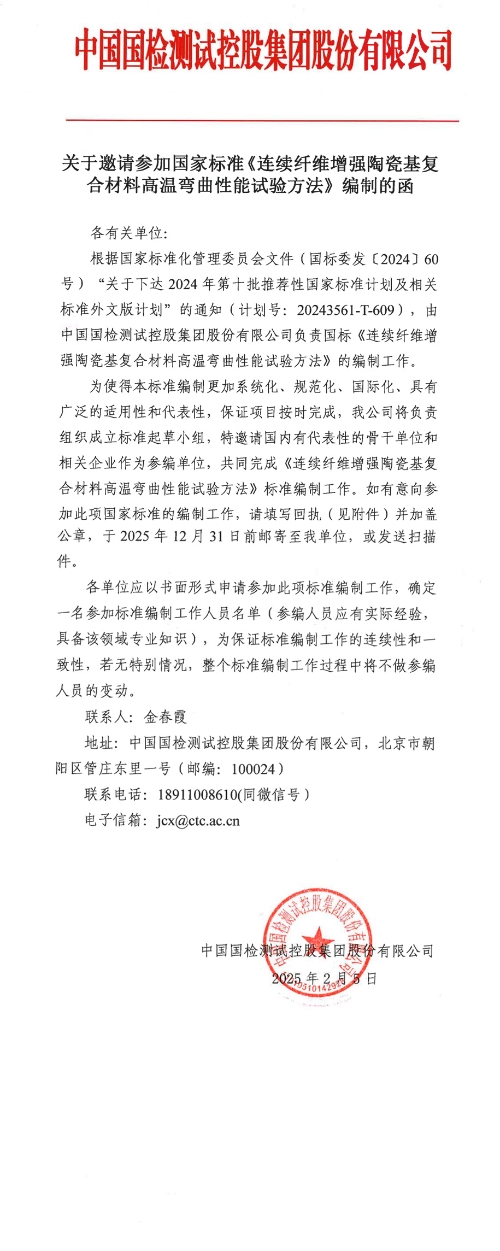 關于邀請參加國家標準《連續纖維增強陶瓷基復合材料高溫彎曲性能試驗方法》編制的函